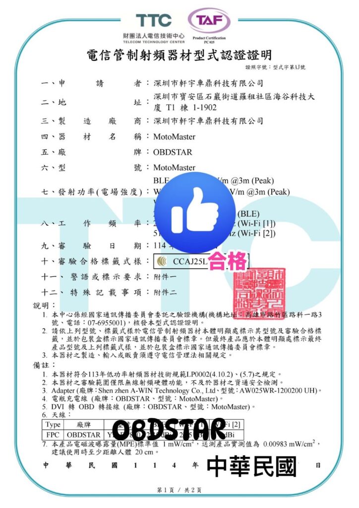 OBDSTAR MotoMaster (MS80) 的持證,不僅是技術的里程碑,更是品牌對台灣市場的尊重與責任。